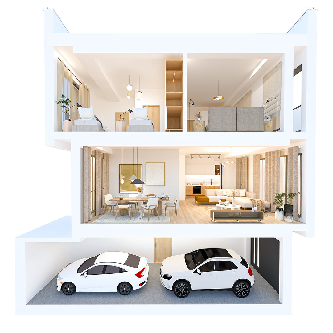 Në një metropol të mbushur me makina parkimi është një domosdoshmëri. Secila prej vilave AbA disponon 2 poste parkimi në ambjentet e brendëshme të vilës. Siguroni makinën tuaj nga faktorët natyrorë!
